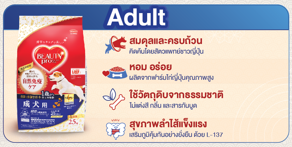 - ผลิตภัณฑ์นี้ได้รับการออกแบบมาสำหรับสุนัขโตเต็มวัย สำหรับลูกสุนัข (อายุไม่เกิน 12 เดือน) โปรดเลือกใช้อาหารสำหรับลูกสุนัขโดยเฉพาะ