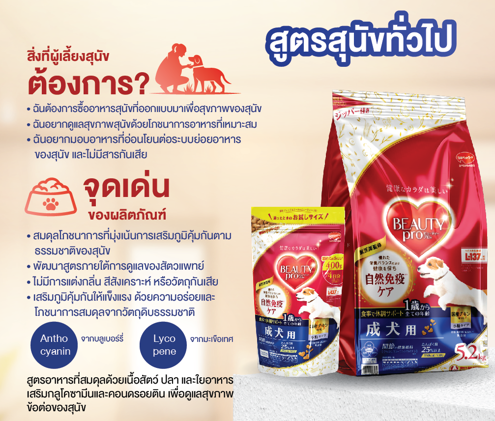 - ผลิตภัณฑ์นี้ได้รับการออกแบบมาสำหรับสุนัขโตเต็มวัย สำหรับลูกสุนัข (อายุไม่เกิน 12 เดือน) โปรดเลือกใช้อาหารสำหรับลูกสุนัขโดยเฉพาะ